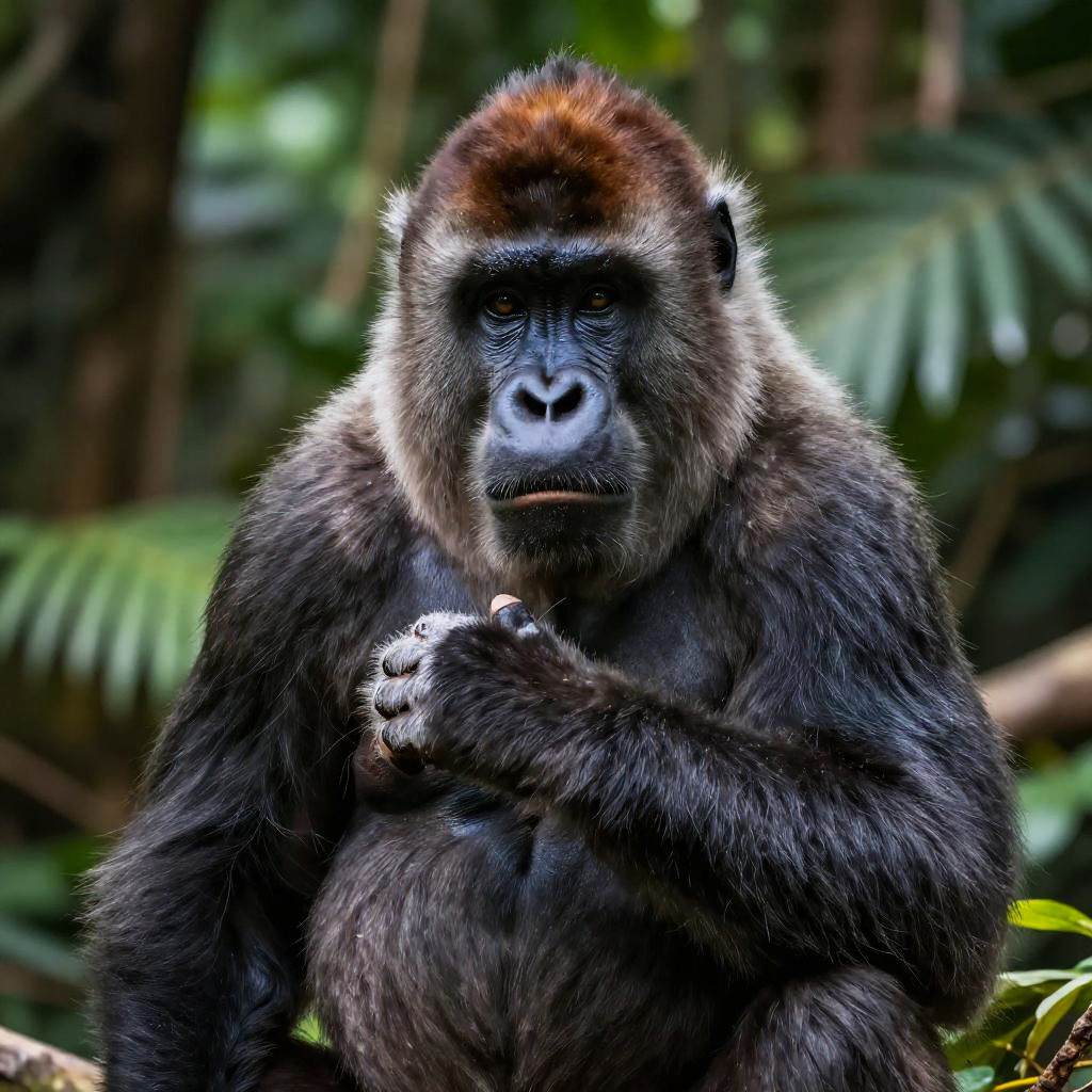 Ape boobs close-up, hyper-realistic, detailed furry texture, strong natural lighting, jungle background, majestic and powerful primate anatomy, vibrant colors
