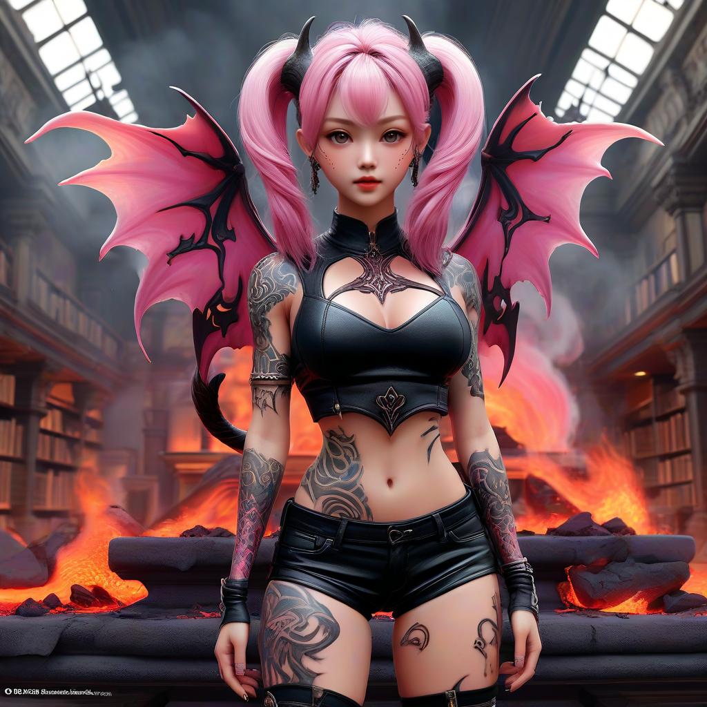 ((best quality)), ((highly detailed)), masterpiece, detailed face, beautiful face, (detailed eyes, deep eyes), (1girl), full body, (imp, small breasts, petite), (mature), (colored skin), ((Orchid pink colored skin:1.44)), medium hair, black hair, streaked hair, (small horns), (leather crop-top, leather short shorts), (small demon wings), symmetrical wings, ((black eyes)), solid eyes, (glowing eyes), colored sclerae, wide hips, demon tail, intricate (tattoos:1.33), (glowing tattoos), rune tattoos, arm_tattoo:1.3, womb_tattoo:1.3, savage grin, monster girl, outside, ((hellscape, fire and lava in the background, active volcano, smoke, ruined buildings)), (indoors, in a library, librarian, book shelves, open book), mcnsfw
