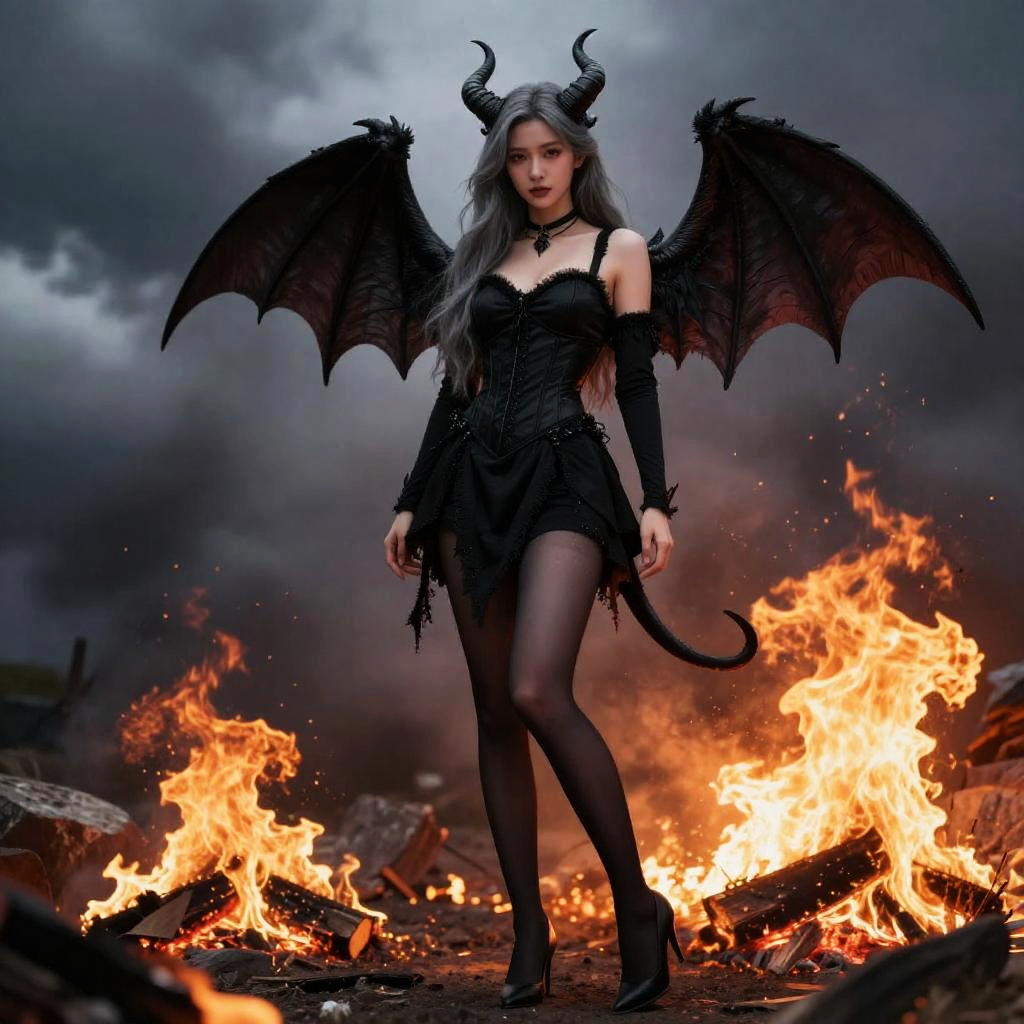 Digital artwork of a pink-haired, tattooed demon girl with bat wings, black leather outfit, and shorts, standing in a fiery, ruined library.