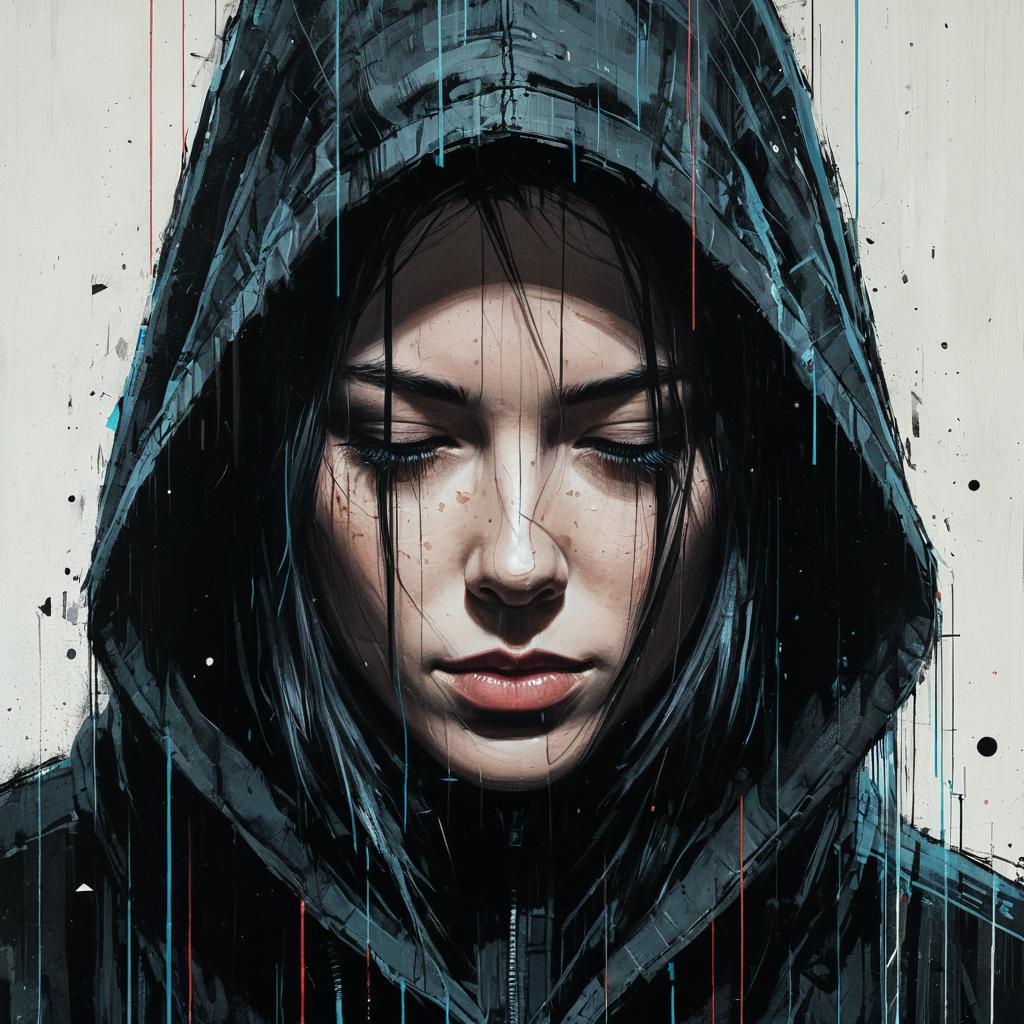 Portrait of a hooded cybernetic woman, mysterious, glitch effects over the eyes, crying, by Guy Denning, by Johannes Itten, by Russ Mills, innocent, hacking effects, cyberpunk, oil on canvas, concept art, abstract