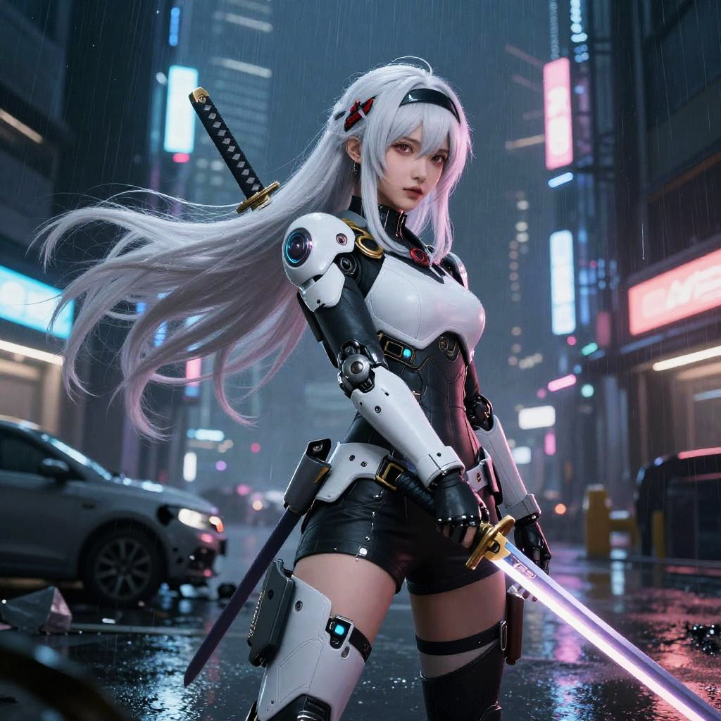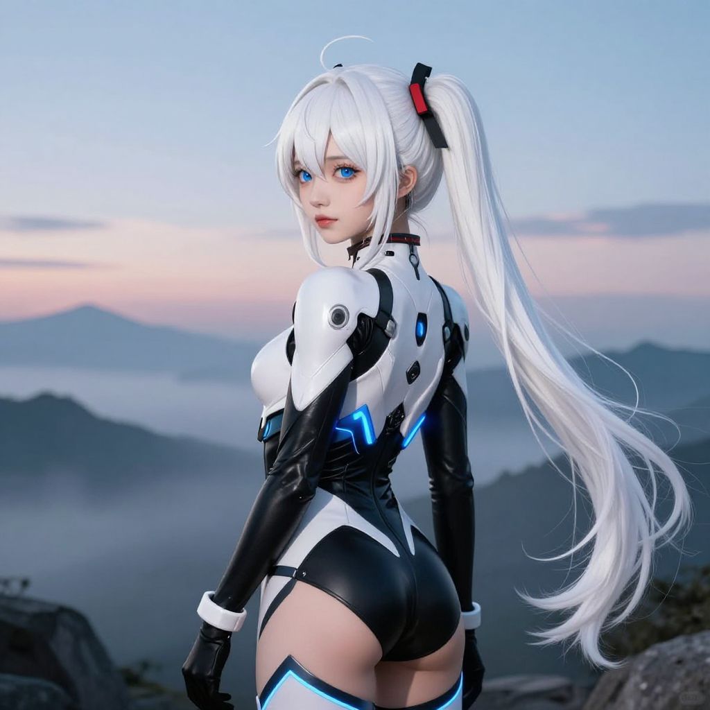 Digital artwork of a white-haired anime girl with blue eyes, wearing a black and white futuristic bodysuit, looking back over her shoulder at a mountain