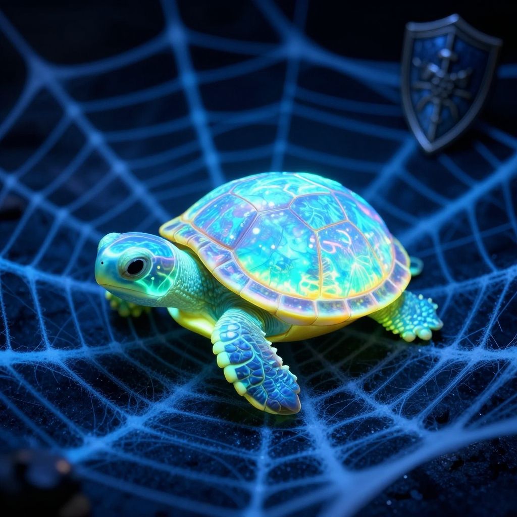 This digitally rendered image showcases a brightly glowing, neon-colored turtle with a vivid blue and yellow patterned shell, resting on a black surface covered in a blue spiderweb-like pattern. The turtle's skin and legs are a mix of blue and green hues, with intricate details highlighting its texture. In the top right corner, there is a small, translucent shield with a blue and gray design. The overall style is hyper-realistic with a glowing effect, giving the scene a futuristic, cybernetic feel. The turtle is centrally positioned, with its head slightly raised and one front leg extended forward.