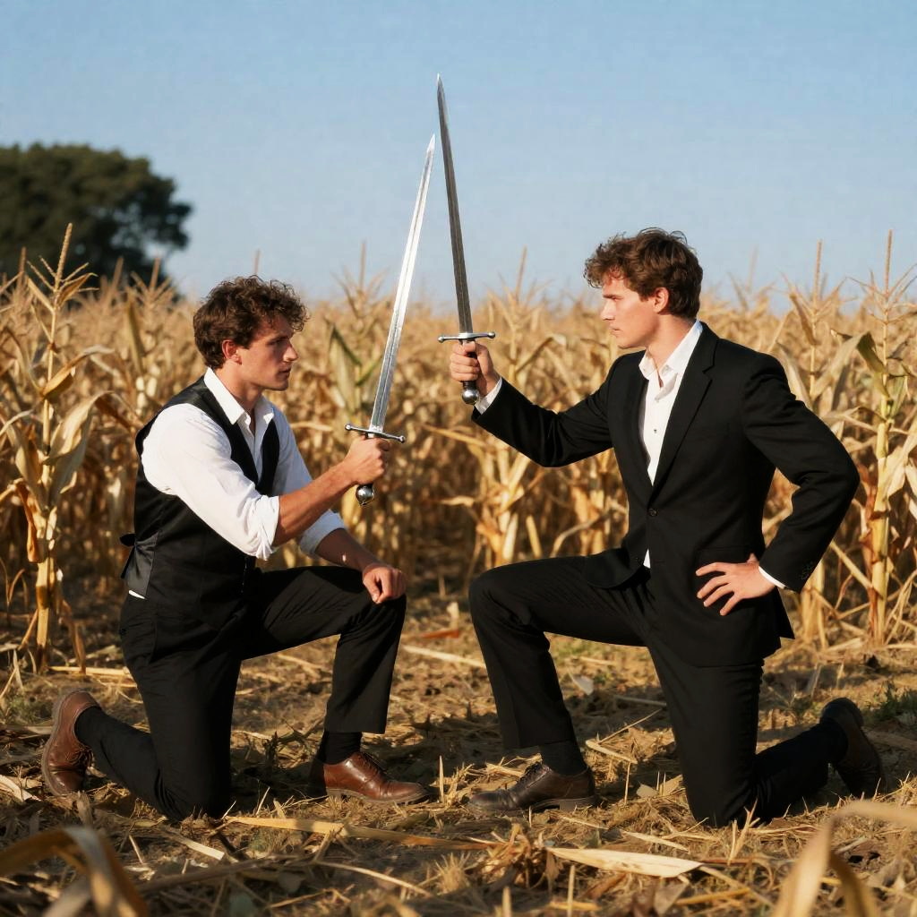 Two men in 18th-century clothing duel with swords in a grassy field. The man on the left wears red pants, the man on the right wears gray pants. Both have intense expressions. Sheep graze in the background. Two additional figures stand to the left. Large dark tree on the left, cloudy sky, and forest in the distance.
