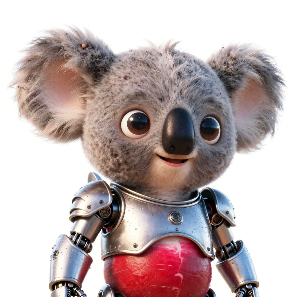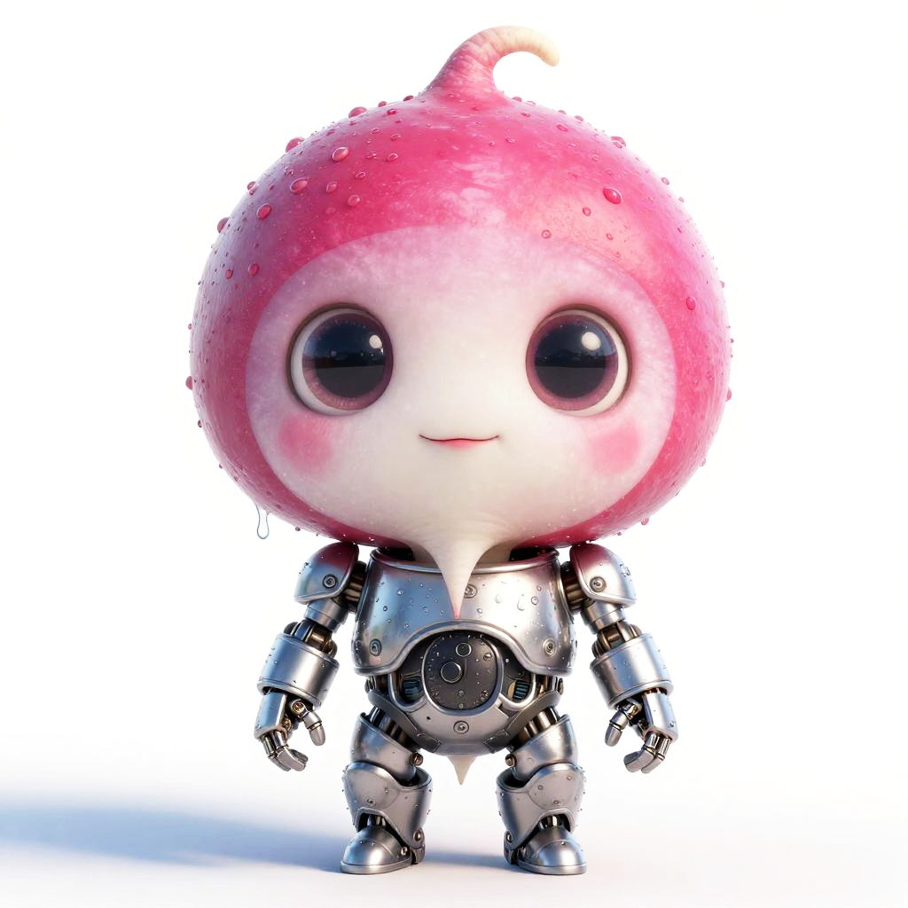 An adorable alien Panda with large round eyes and a small smiling mouth wearing robotic silver armor, radish skin, soft diffused cinematic lighting, wet, for games, game asset, white background, style expressive, 8k