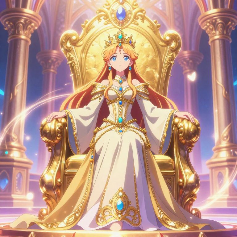 Anime queen standing on a majestic throne adorned with intricate gold and jewels, flowing royal robes, vibrant fantasy palace background, glowing mystical aura