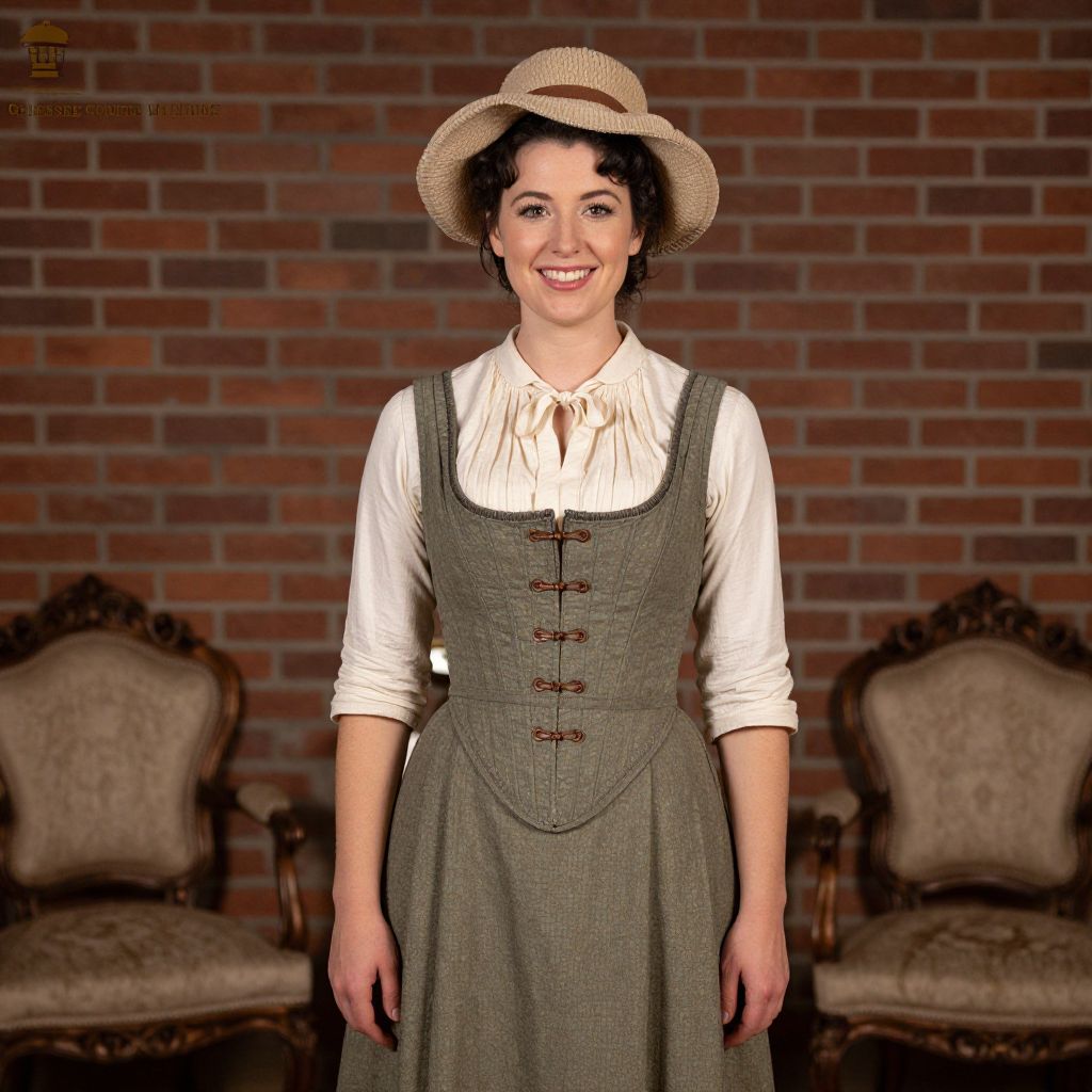 Smiling woman wearing an 1800s-style ensemble, including a beige hat, cream blouse, and olive-green corset dress with brown buckles, stands indoors at the Genesee Country Village & Museum, flanked by two ornate chairs against a brick wall backdrop.