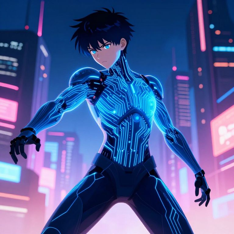 Anime character AI designed as a high-tech android with luminous blue circuitry patterns on the skin, dynamic pose against a backdrop of a bustling virtual metropolis, vibrant colors and sharp contrasts emphasizing the blend of humanity and artificial intelligence