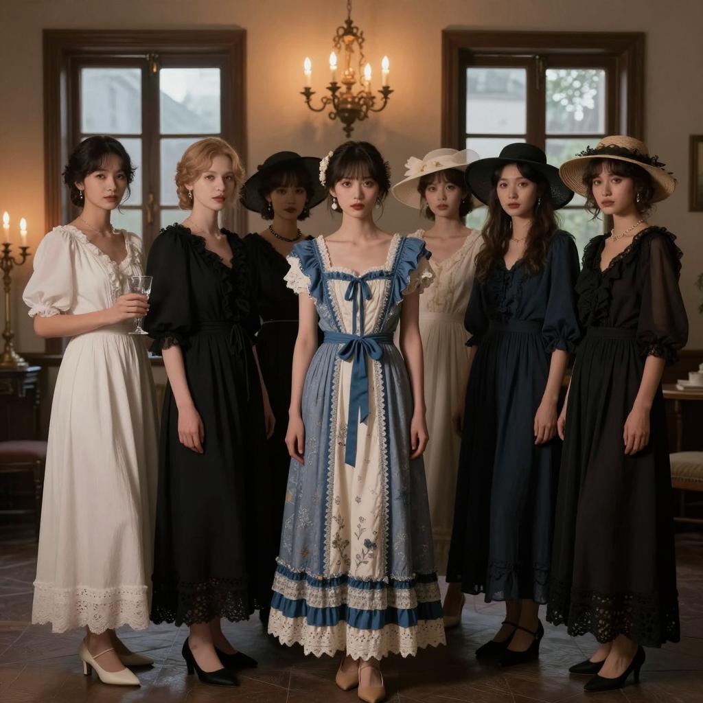 A woman in an off-the-shoulder, ruffled dress, wearing a wide-brimmed hat with flowers, standing near an ornate mirror reflecting a lace dress. She holds a book, looking to the side. Arched hallway with wooden furniture in the background. Two people visible, one in the mirror. Woman's expression is calm.