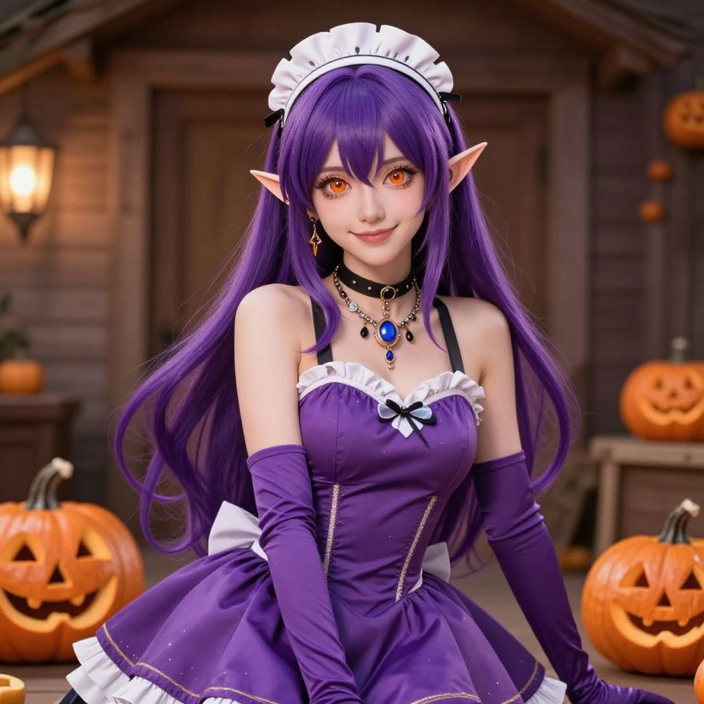 A digital, anime-style portrait of a young, fair-skinned woman with long, vivid purple hair and pointed elf ears. She wears a purple, frilled maid dress with white lace trim, elbow-length gloves, and a white headpiece. Her red eyes glow subtly, and she's adorned with a black choker and blue gem necklace. She stands in front of a wooden, dimly-lit house adorned with carved pumpkins, including a prominent jack-o'-lantern to her right. The background features warm lantern light and a cozy, Halloween-themed atmosphere. The image is highly detailed with a realistic texture and vibrant colors.
