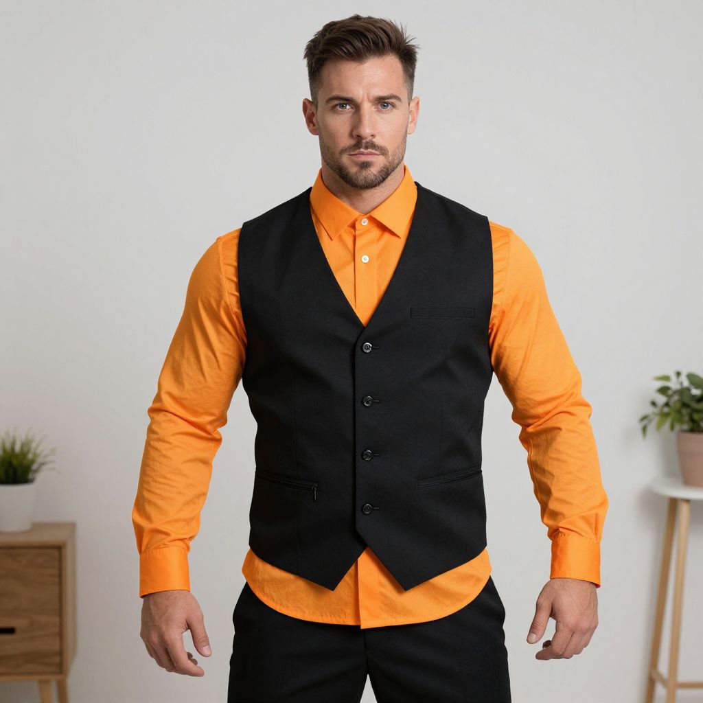 Muscle Fit Shirts Costume, a man in a black vest and orange shirt standing in a room
