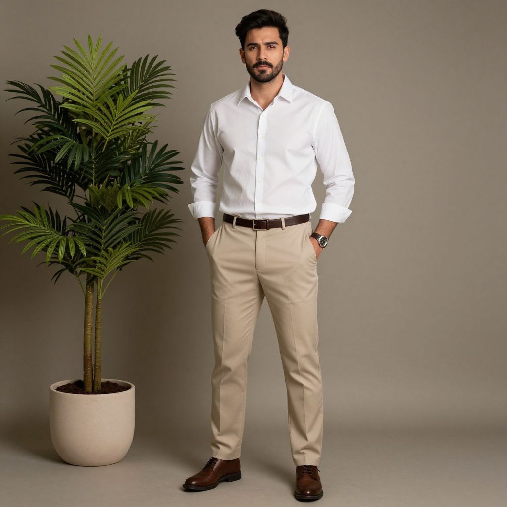 "beige trousers man costume, 1boy, male focus, solo, facial hair, plant, belt, mustache, shirt, full body, standing, brown footwear, hands in pockets, black hair, potted plant, pants, shoes, looking at viewer, beard Realistic photo of casual sexy person with pretty face"