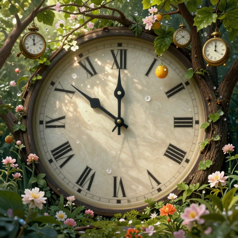 Craft an image reminiscent of surrealist art, depicting a close-up of a clock face emerging from a lush garden teeming with overgrown foliage and blossoming flowers. In place of traditional hands, the clock is adorned with towering tree branches, each leaf bearing miniature clocks that dangle like fruit. This surreal landscape should convey a sense of timeless wonder as sunlight filters through the verdant canopy, casting an ethereal glow on petals and clocks alike. Include intricate details such as tiny insects navigating among the clocks or delicate dewdrops adorning the blossoms to fully immerse viewers in this whimsical, imaginative scene that blurs the line between nature and mechanical elements.