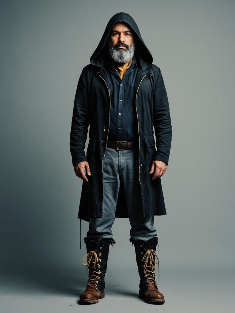 Adult male costume, 1boy, solo, male focus, standing, hat, full body, long sleeves, boots, looking at viewer, brown footwear, belt, closed mouth, facial hair
