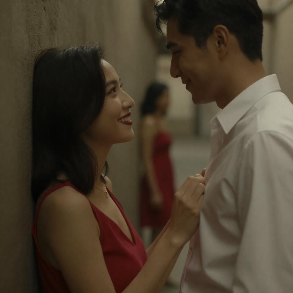 Photograph of a man kissing the cheek of a woman with dark hair and a necklace. Woman with closed eyes, slight smile, wearing a black sleeveless top. Man in a dark shirt, short dark hair, kissing her left cheek. Warm, dimly lit background with a lamp and wooden panel.
