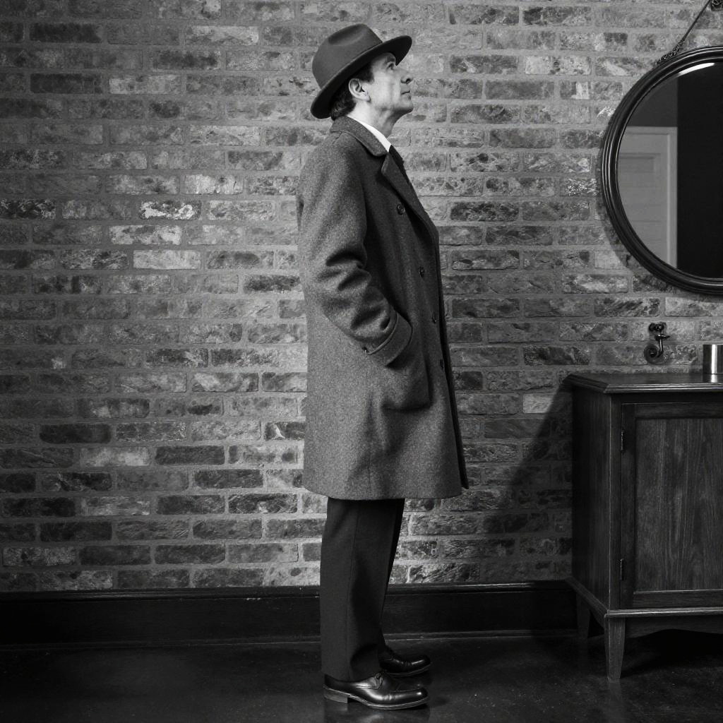 Black-and-white photograph of a middle-aged man standing in profile against a brick wall. He's wearing a wide-brimmed hat, a long, buttoned-up overcoat, dark pants, and black shoes. His hands are tucked into his coat pockets. To his right, there's a round mirror on the wall and a dark wooden cabinet at the bottom. He's looking upwards. The floor is dark and shiny.