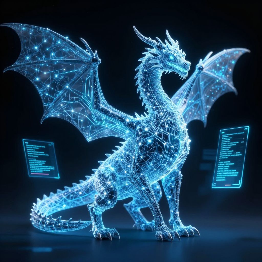 AI dragon generator theme, dragon made of interconnected neural network patterns, glowing circuits tracing wings and tail, floating holographic screens displaying code, dark futuristic background, extraordinary blend of mythic creature and AI technology