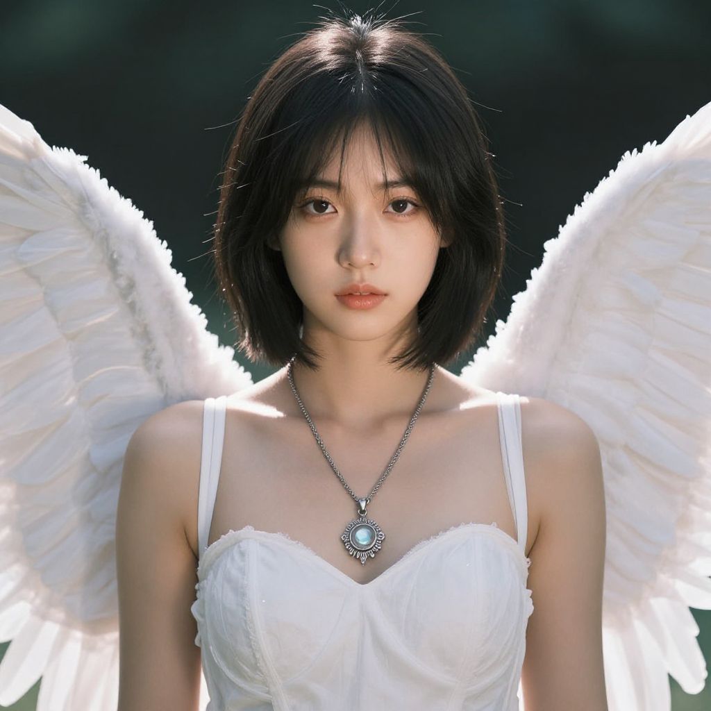Light angel costume, 1girl, solo, wings, angel wings, realistic, necklace, looking at viewer, black hair, jewelry, upper body, angel, lips, short hair