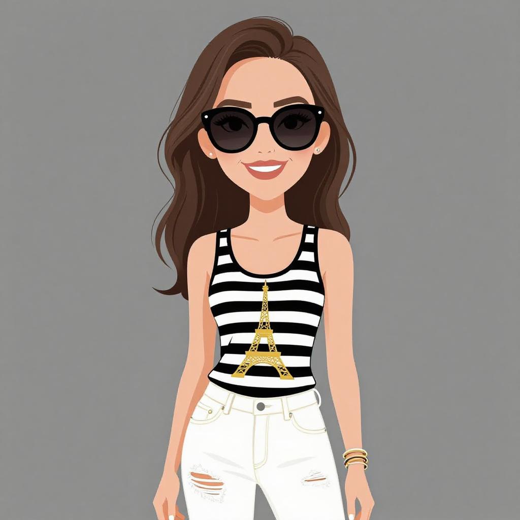 Marinette full body character art, soft pastel color palette, expressive eyes, elegant pose with hand on hip, detailed hair strands, subtle background with Eiffel Tower silhouette