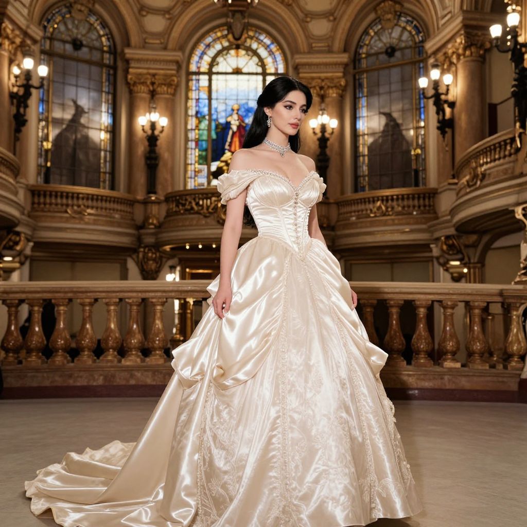 An elegant woman with long black hair and a refined oval face wearing a luxurious belle ball dress and costume, walking through a grand opera house with gilded balconies and elegant stained glass windows, the dress features satin sheen and a full train catching the stage lights. The woman has big breasts and cute face