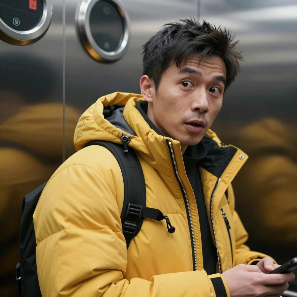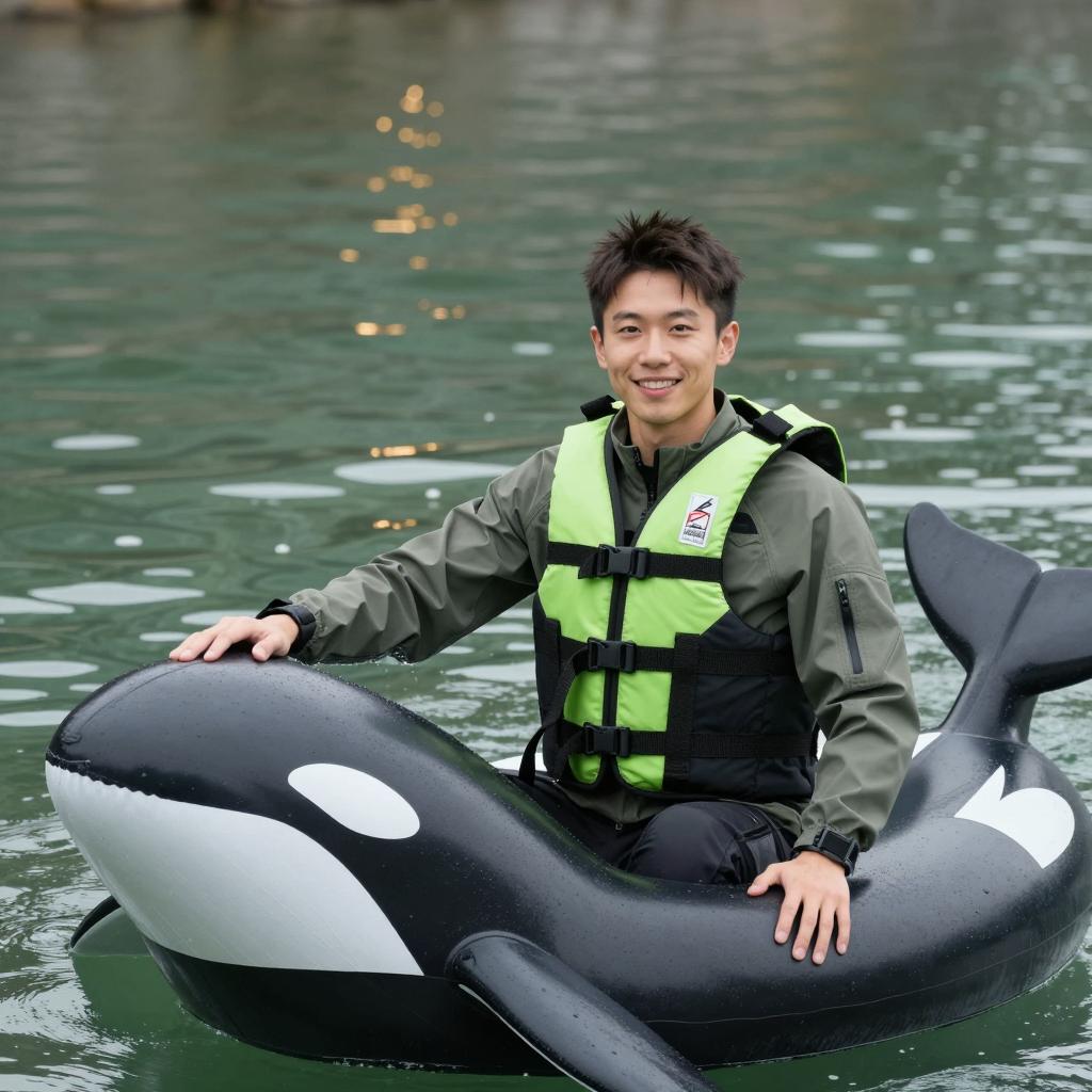 Young man with short dark hair, smiling, wearing a green jacket and black and green life jacket, sitting on an inflatable black and white orca-shaped float in green water. He is holding the orca's head with his right hand. Sunlight reflects off the water.