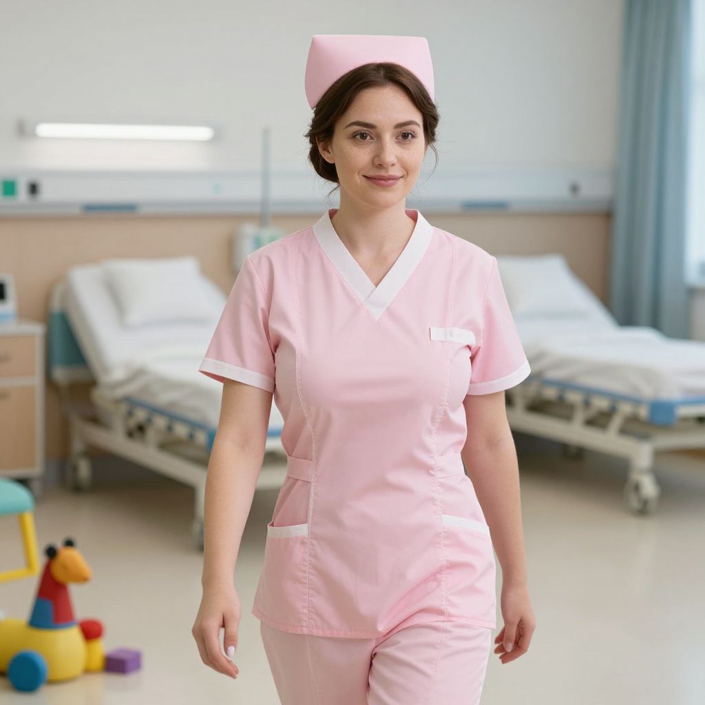 Photograph of a young woman with fair skin and dark brown hair, styled in a neat updo, wearing a light pink nurse uniform with a matching cap. She stands confidently in a bright, sterile hospital room with two empty white and blue hospital beds in the background. A colorful toy set, including a yellow and red monkey, is on the floor to the left. The room has white walls and light blue curtains. The woman smiles gently, exuding a calm and professional demeanor.