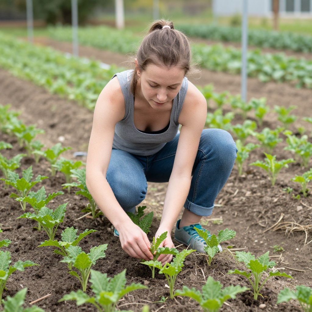 Woman tending to young green plants in an Eco-Institute farm field, showcasing sustainable agricultural practices. Photo courtesy of Abbey Cmiel.