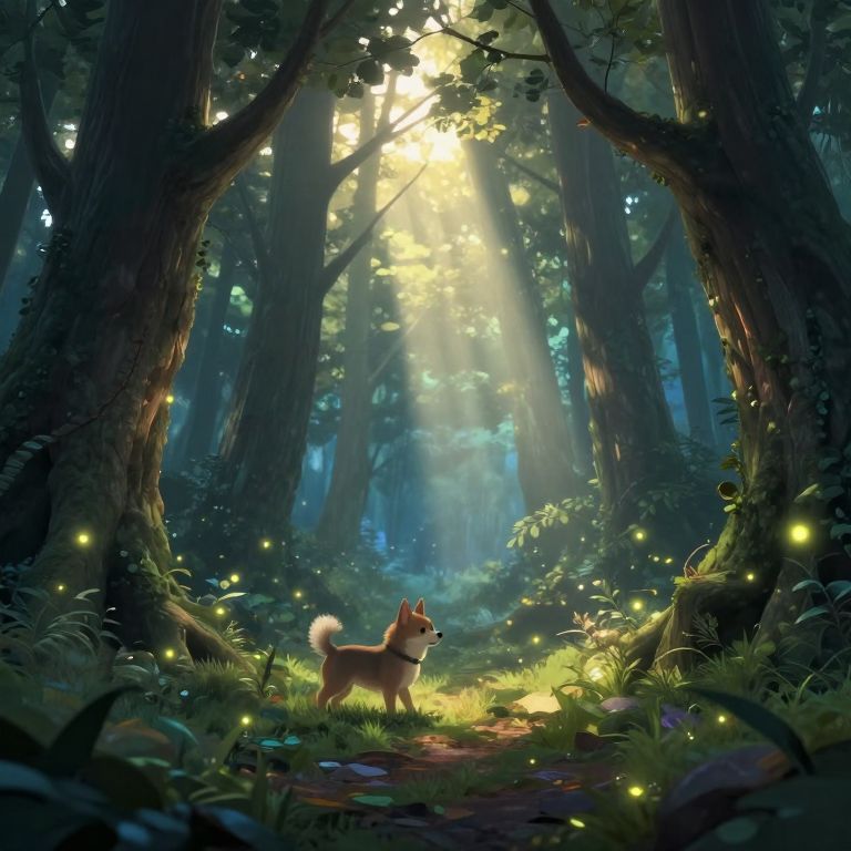 Puppie exploring a mystical forest clearing at dawn, magical light beams breaking through ancient trees, enchanting atmosphere with glowing fireflies, ethereal colors, fantasy realism style, intricate texturing and depth.