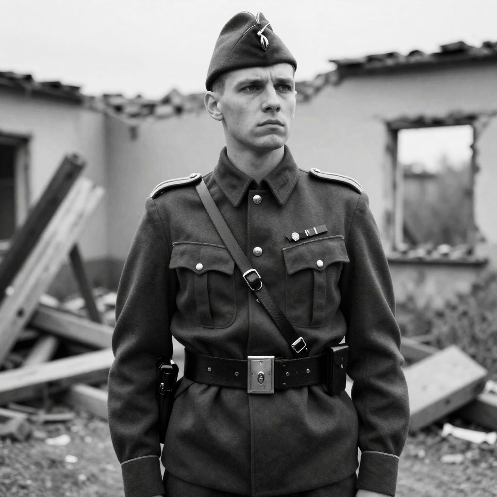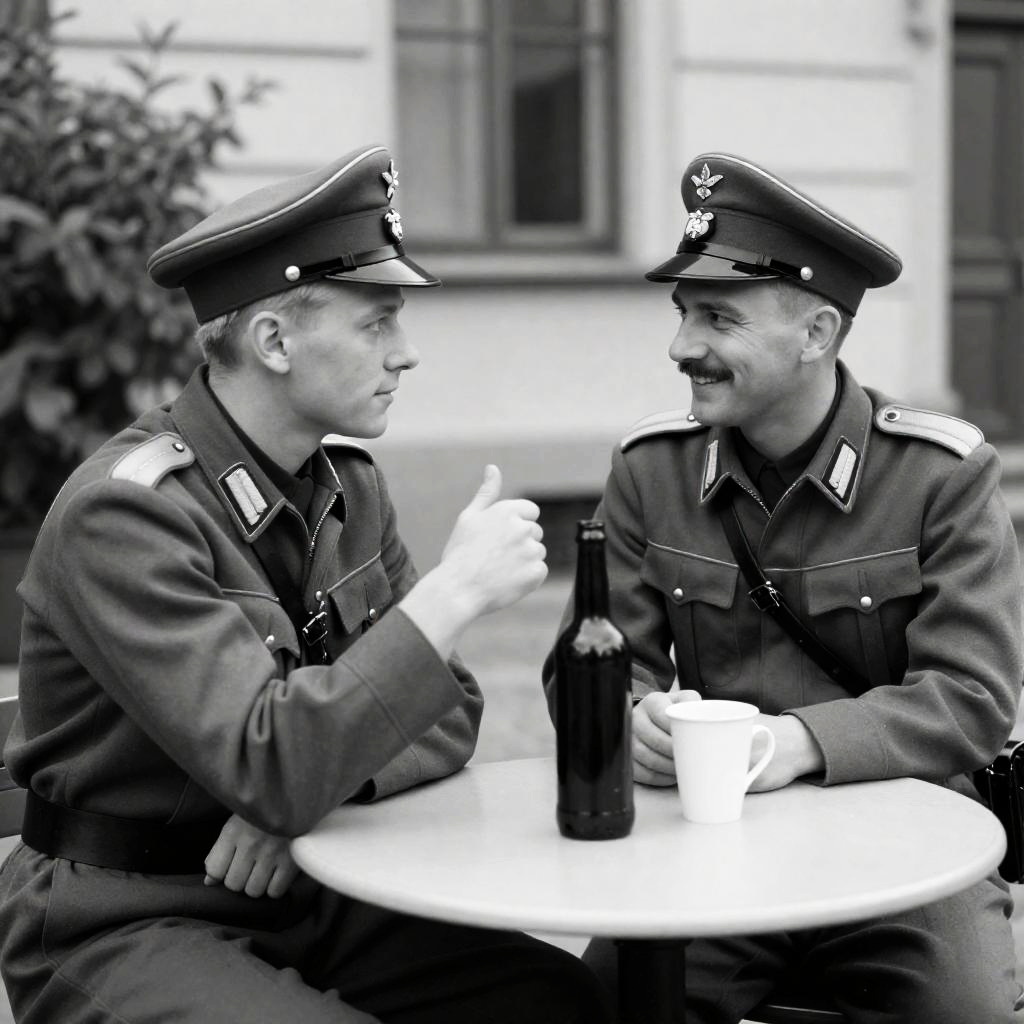 Black-and-white photograph of two Nazi soldiers in uniform sitting at a round table. Left soldier with blond hair, gesturing with right hand, wearing peaked cap with Nazi insignia. Right soldier with mustache, smiling, also in peaked cap. Bottle and cup on table. Background with plants and building. Both soldiers facing each other.