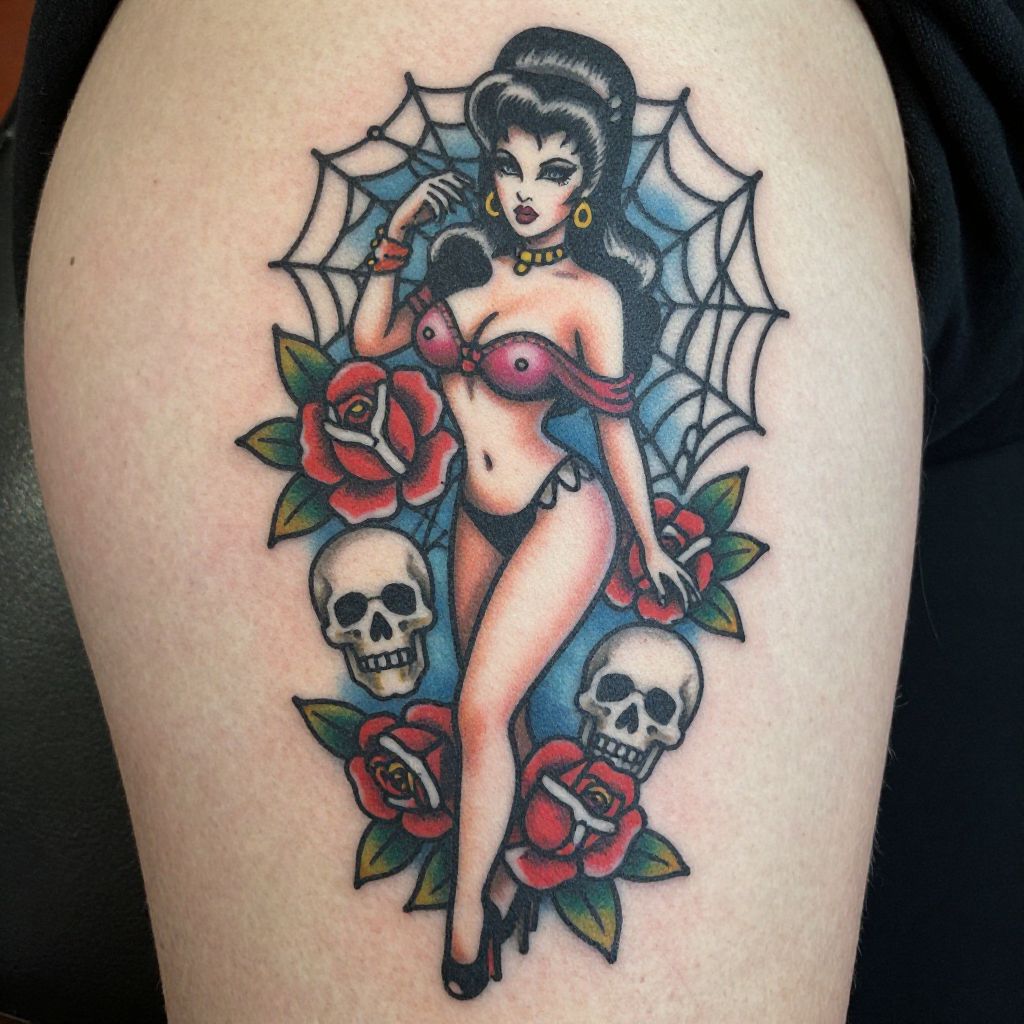 Elvira pinup tattoo design, featuring a sultry gothic pinup woman posing confidently, adorned with vintage tattoo motifs like roses, skulls, and spider webs, vibrant ink colors on pale skin, in a mix of classic Americana and dark gothic aesthetics.
