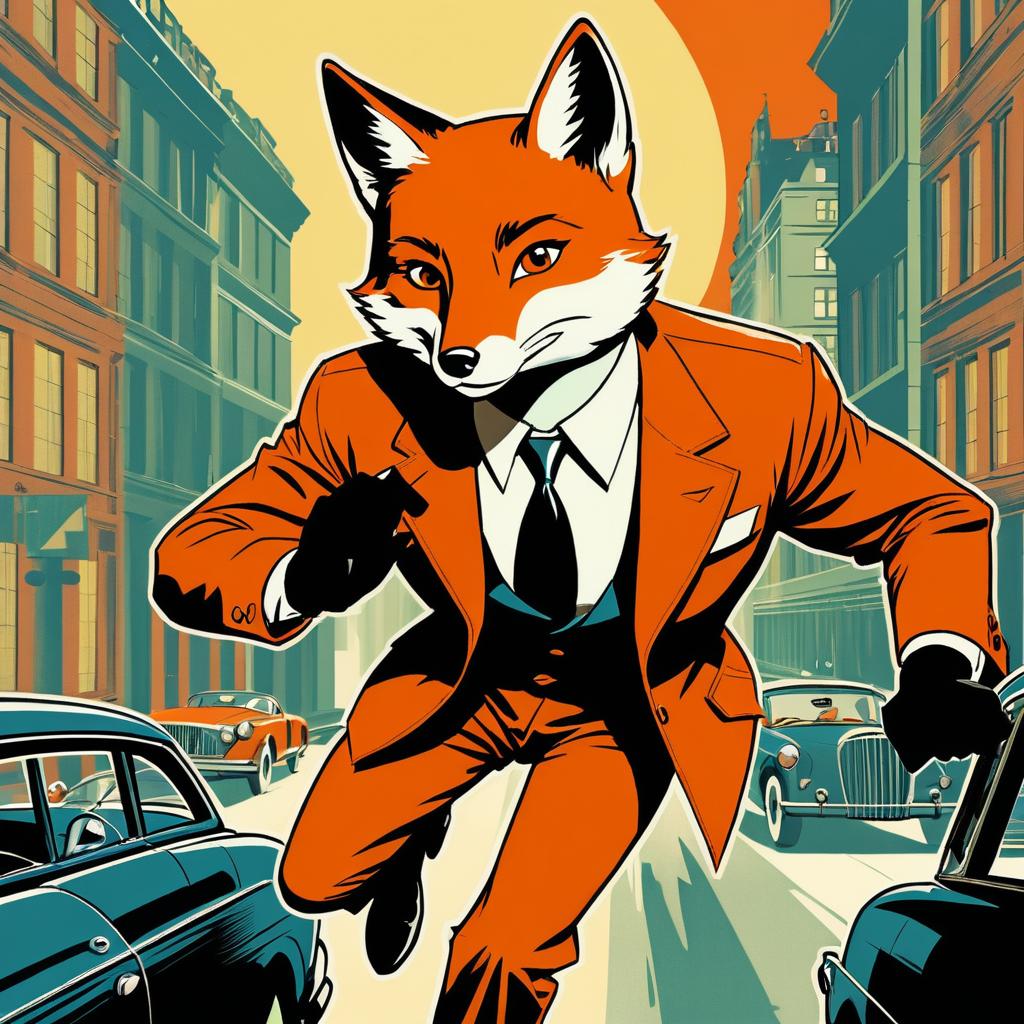 Retro comic book cover of a charming fox as a spy, dynamic and adventurous.
