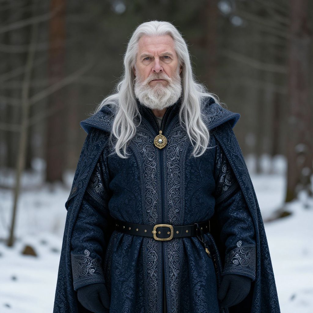 Photograph of an older white man with long, white hair and a full white beard standing in a snowy forest. He's wearing an ornate, dark blue, medieval-style cloak with intricate silver patterns, and a black belt with a gold buckle. His expression is serious, and the background is blurred with tall, dark trees. The overall vibe is fantasy or historical.