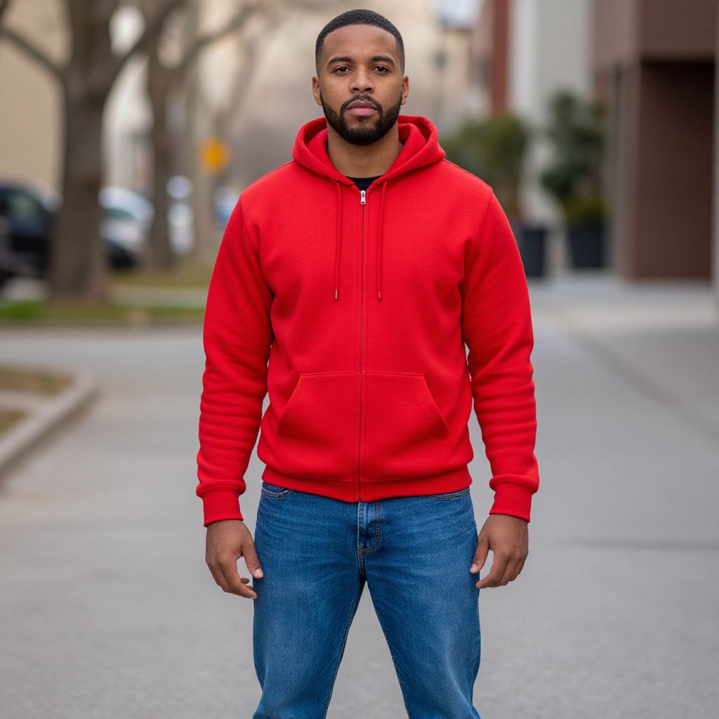 "Short Zipper King, man in a red hoodie and blue jeans posing for a picture"