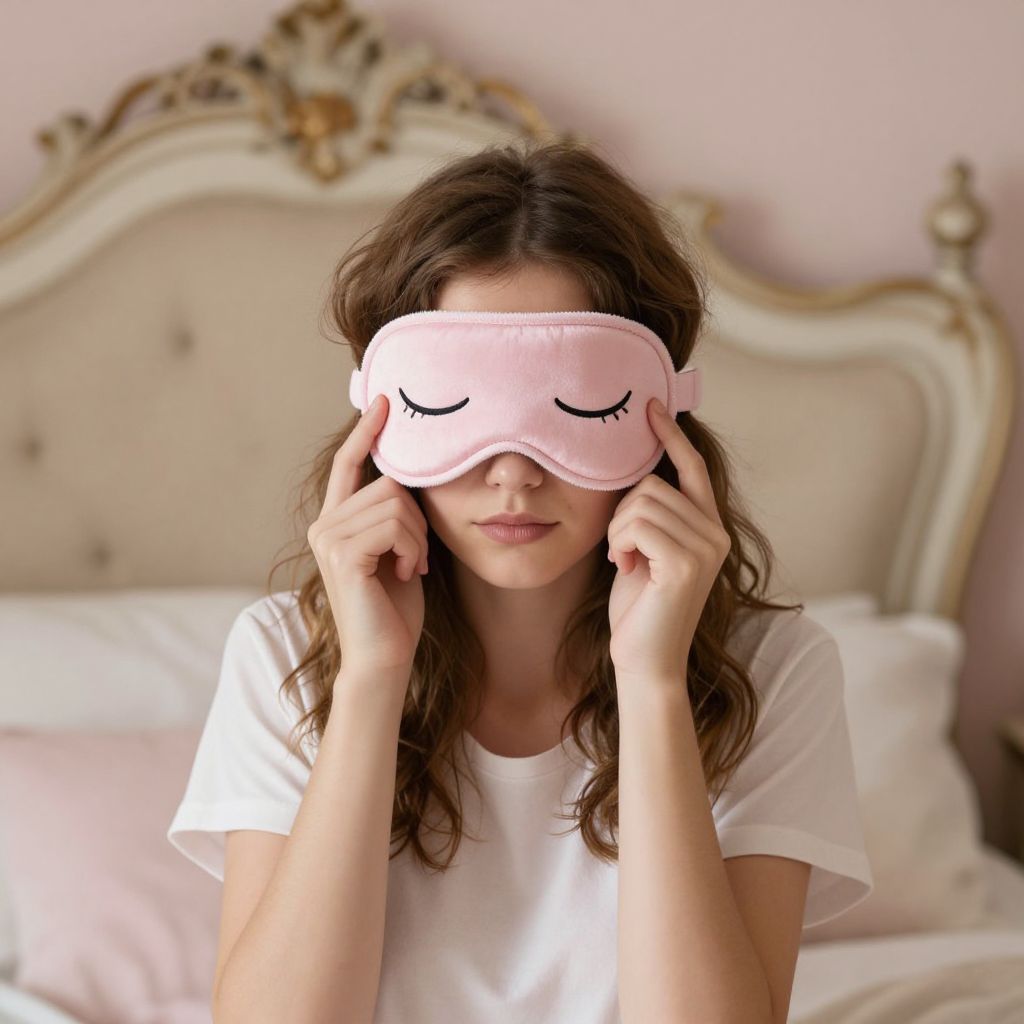 Photograph of a young woman with long brown hair, wearing a white short-sleeve pajama top, sitting in a bed with white pillows and a cream-colored, ornate headboard. She is holding a pink sleep mask with cute, closed-eye cartoon faces over her eyes, partially covering her face. The room is softly lit, creating a gentle, cozy atmosphere. Her hands are positioned near the top of the mask, adjusting it. The background is slightly blurred, focusing attention on her and the sleep mask. The overall mood is relaxed and serene.