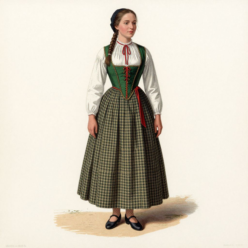 Photorealistic digital illustration of a young woman standing against a white background. She wears a traditional Bavarian outfit with a green and black plaid skirt, a white long-sleeved blouse with a high neckline, and a green corset with red lacing. Her dark brown hair is braided and pinned to the side. She has fair skin and a serious expression. She wears black Mary Jane shoes and stands with her arms relaxed by her sides. The background is plain white, emphasizing the detailed and colorful clothing.