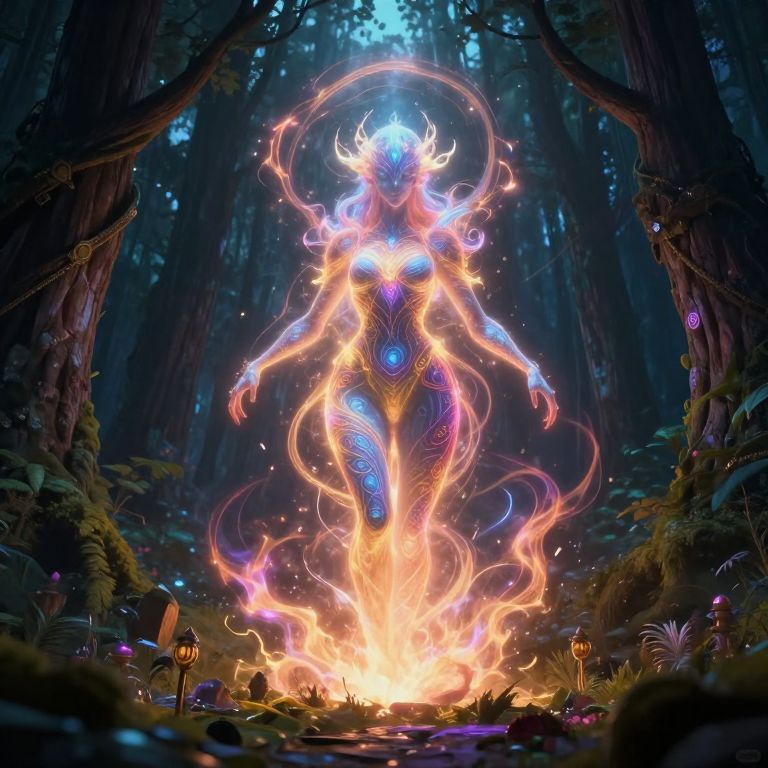Mahorage spirit emerging from a magical portal in a dark enchanted forest, luminous aura with swirling energy, intricate and mystical patterns on its body, fantasy digital art with rich colors and dramatic lighting.
