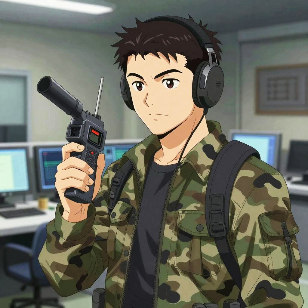 Realistic photo.an intrepid signal jamming expert, wearing a camouflage jacket and wireless headset, holding a high-tech jamming device, set in a high-security control room filled with monitors, illustrated in the bold and cheeky anime style of Monkey Punch. realistic photo