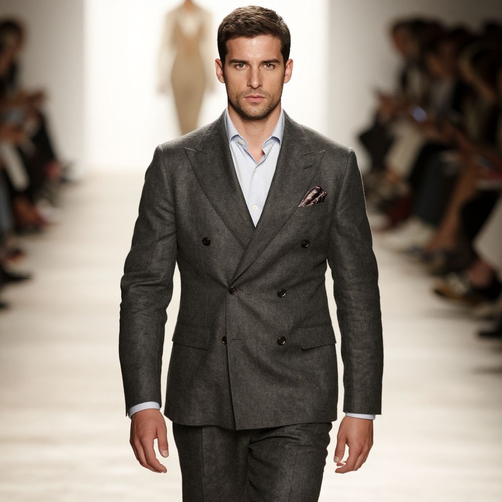 Photograph of a handsome man with short, dark brown hair and light skin, walking down a brightly lit runway. He wears a dark gray, double-breasted suit with black buttons, a white dress shirt, and a pink pocket square. The background is blurred but shows seated spectators on either side of the runway. The man's expression is confident and focused, and the overall style is modern and sophisticated. The runway lighting creates a strong contrast, highlighting the subject.