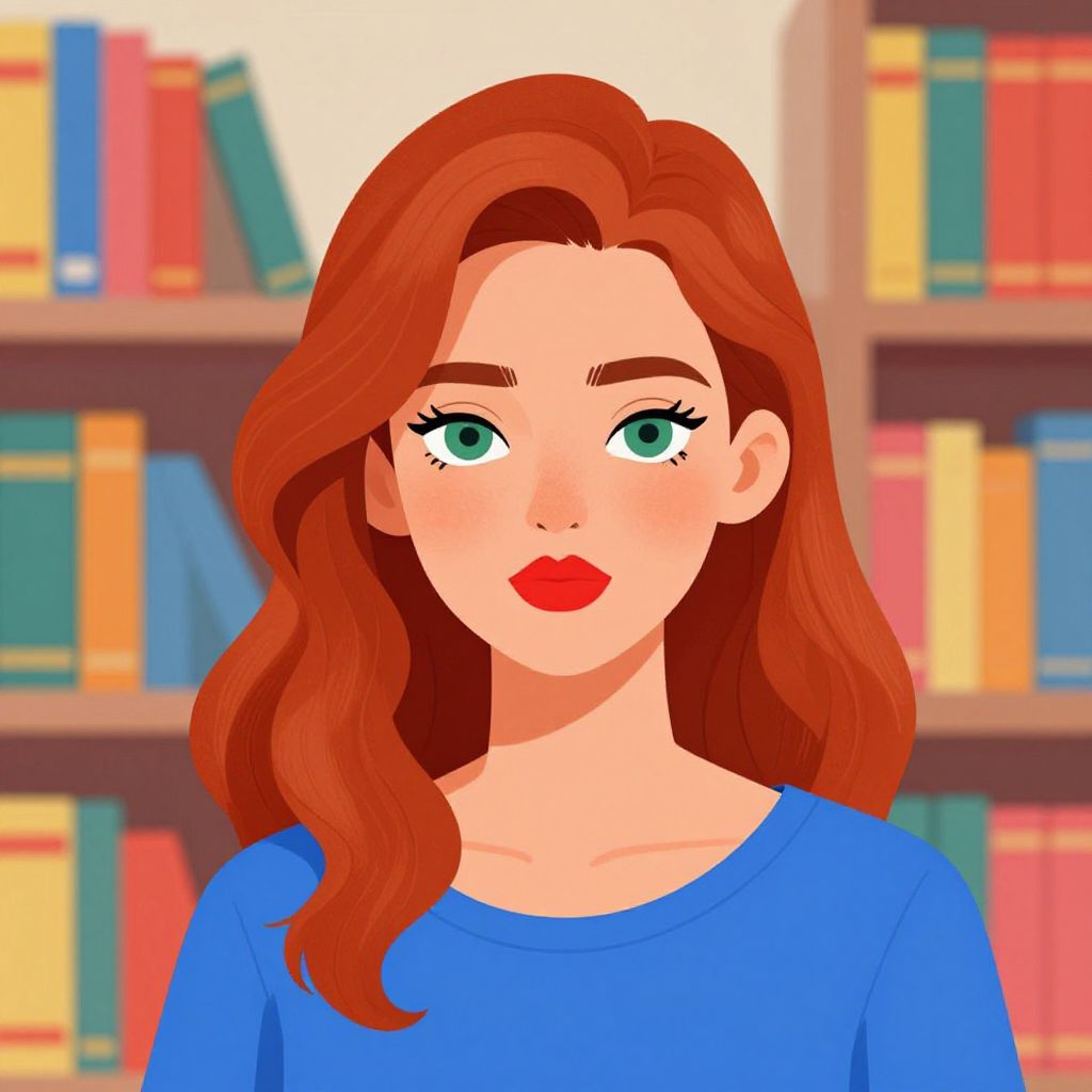 Digital illustration of a red-haired woman with green eyes, blue shirt, red lips, and wavy hair, standing in front of a bookshelf.