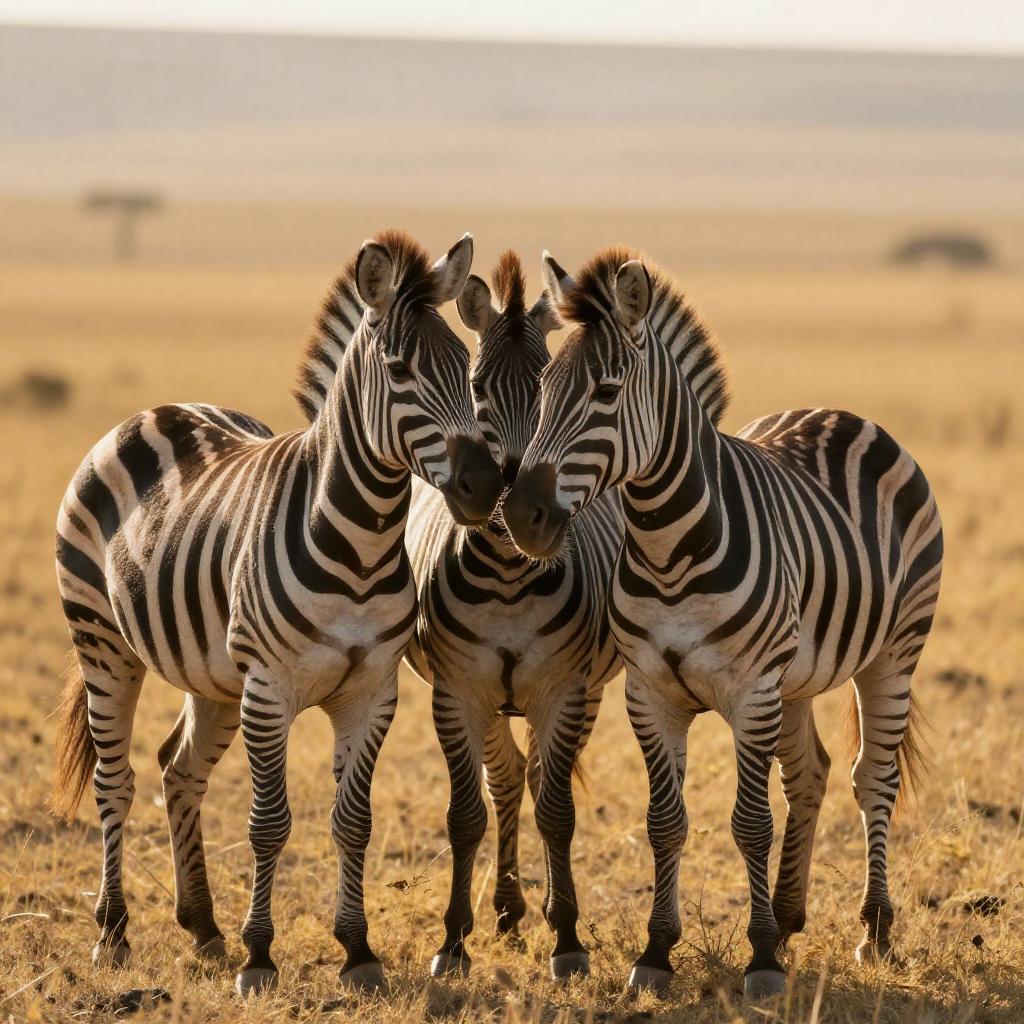 Photograph of three zebras standing close together in a golden, sunlit savannah. Their black and white stripes contrast with the warm, glowing grass. One zebra is slightly turned to the right, while the other two face forward, almost touching noses. The background is a vast, open field with soft, shimmering light, creating a peaceful, natural setting.