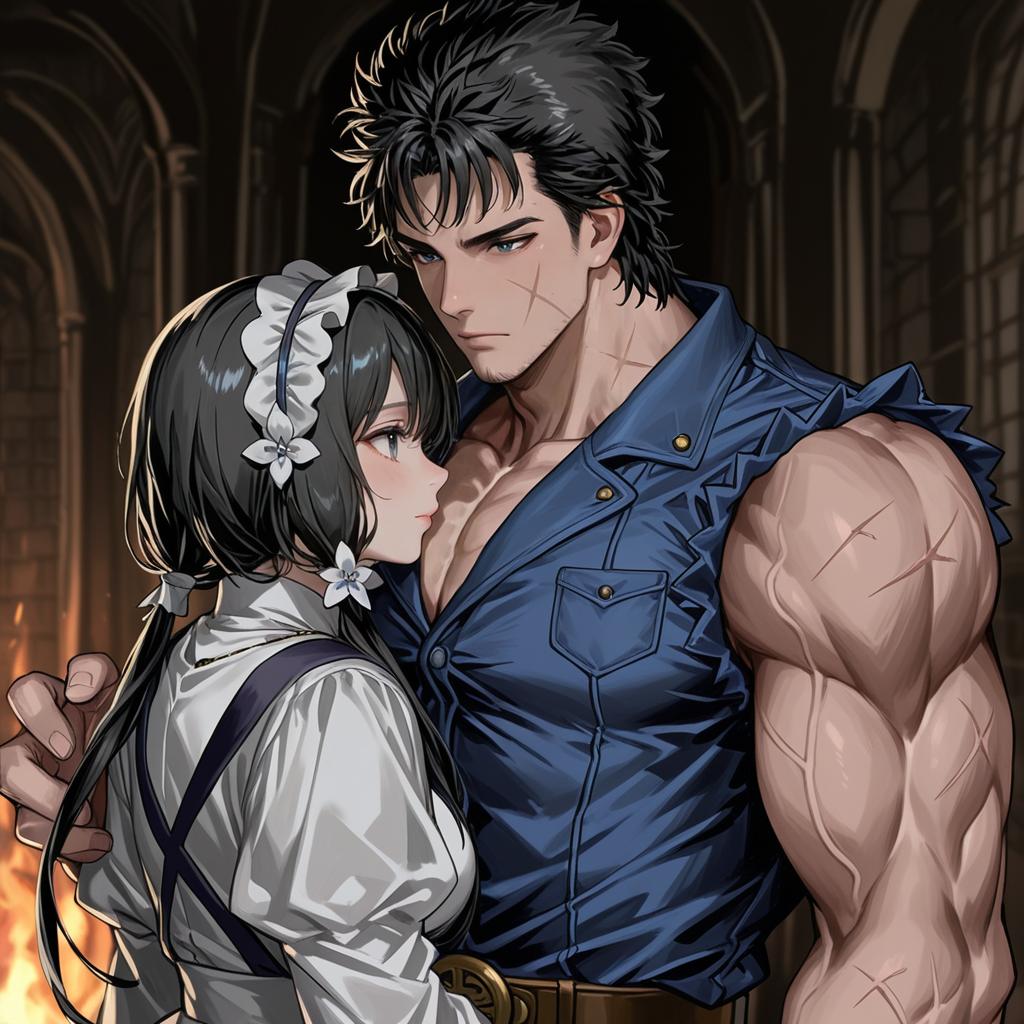 Digital anime-style illustration featuring a muscular man with black hair, multiple scars, and a blue sleeveless shirt holding a young maid girl. The maid has black hair adorned with white ribbons and a headpiece, wearing a white blouse with a blue dress. The background is a dimly lit medieval-style stone corridor.