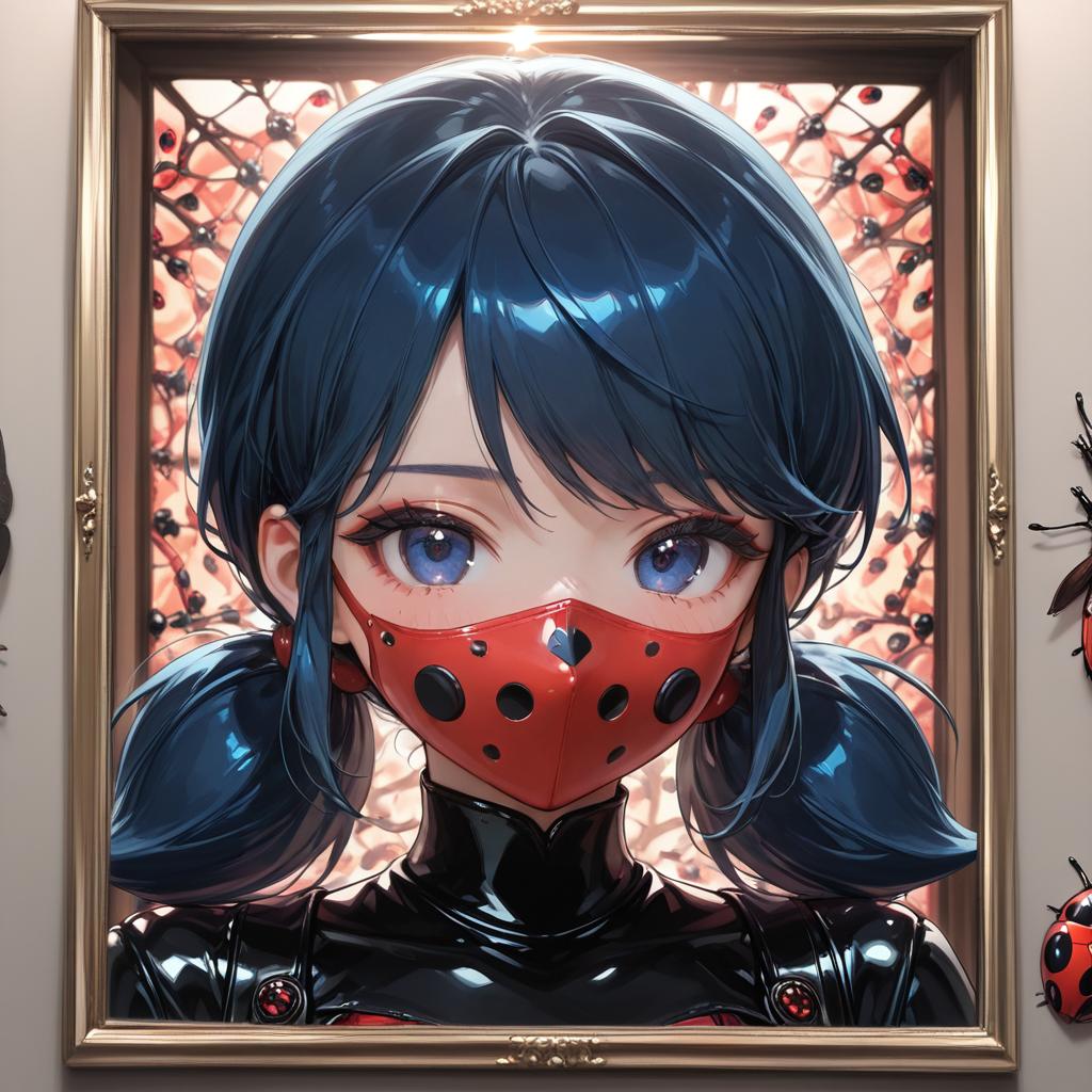 High-quality digital artwork of a girl with blue hair styled in ponytails, wearing a red and black ladybug-themed mask and full body suit. The image features perfect lighting and intricate detailing, focusing on the character's captivating purple eyes and glossy costume. The background includes a framed artwork with ladybug elements, emphasizing the themed design.