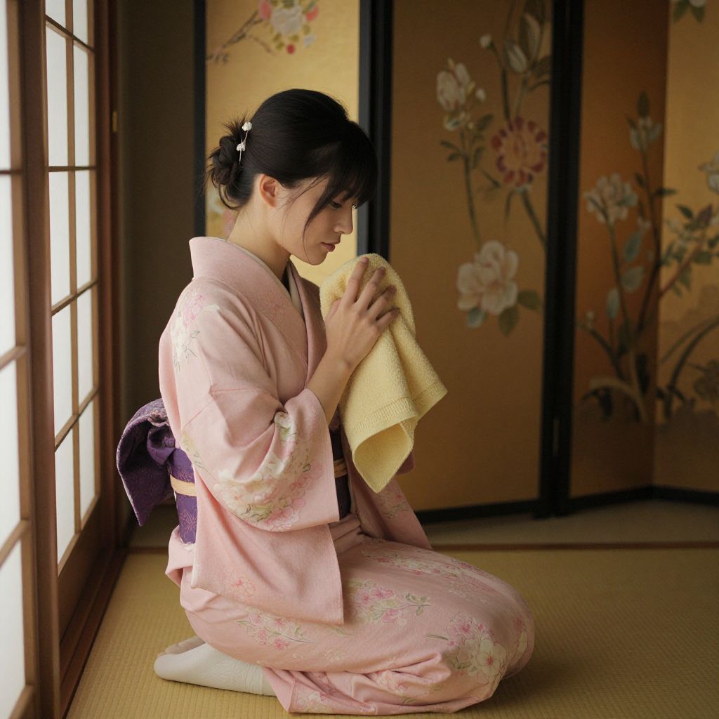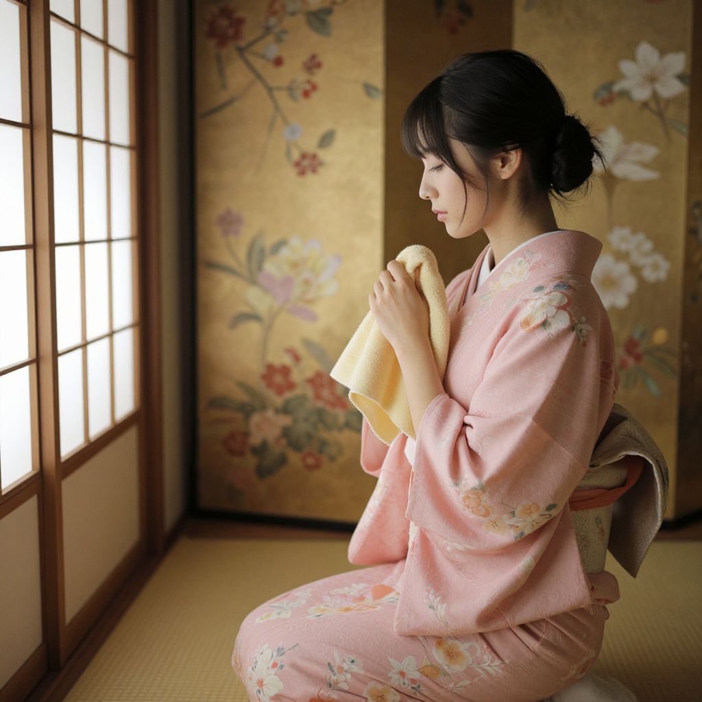 In a quiet chamber bathed in soft light, a woman in a pink kimono sits before a floral-patterned shoji screen, her hand tenderly cradling a yellow towel—a moment of introspection where the delicate balance of tradition and self-reflection is mirrored in the stillness of her pose and the subtle warmth of her surroundings.