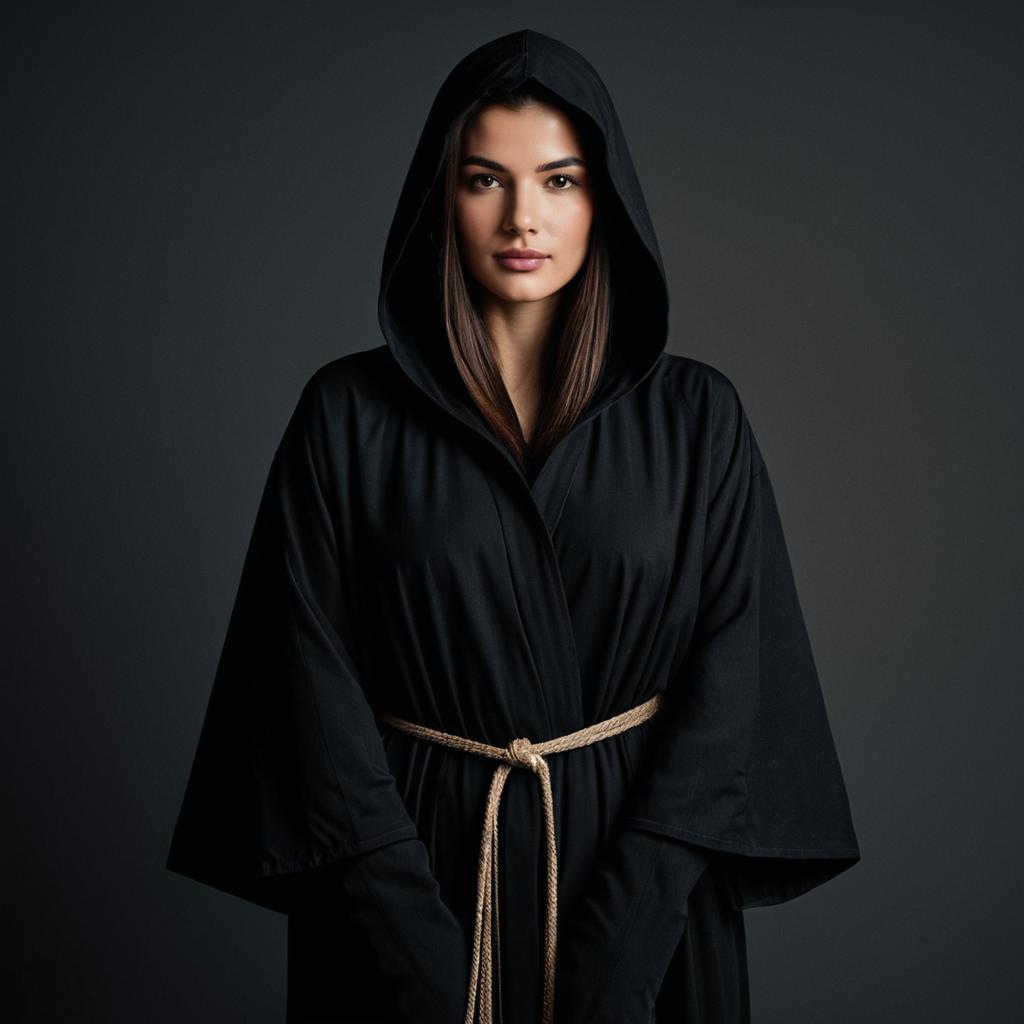 Black abaya, photorealistic portrait of a woman, wearing a black hooded robe, standing against a dark gray background, soft lighting, neutral expression, straight brown hair covered by hood, simple and elegant, robe with a belt, muted colors, minimalistic style, subtle shadows, slight ure on robe, upper body shot, casual and mysterious atmosphere