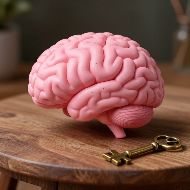 Photograph of a realistic, pink, 3D-rendered human brain with detailed, ridged textures, placed on a rustic, wooden table. An antique, brass key with a black handle lies in the foreground, slightly to the right. The background is blurred, featuring dark, muted colors and a hint of green foliage in the left corner. The brain's pink color contrasts with the warm, brown wood grain of the table, creating a striking visual. The key's vintage style adds an element of mystery and intrigue to the composition.