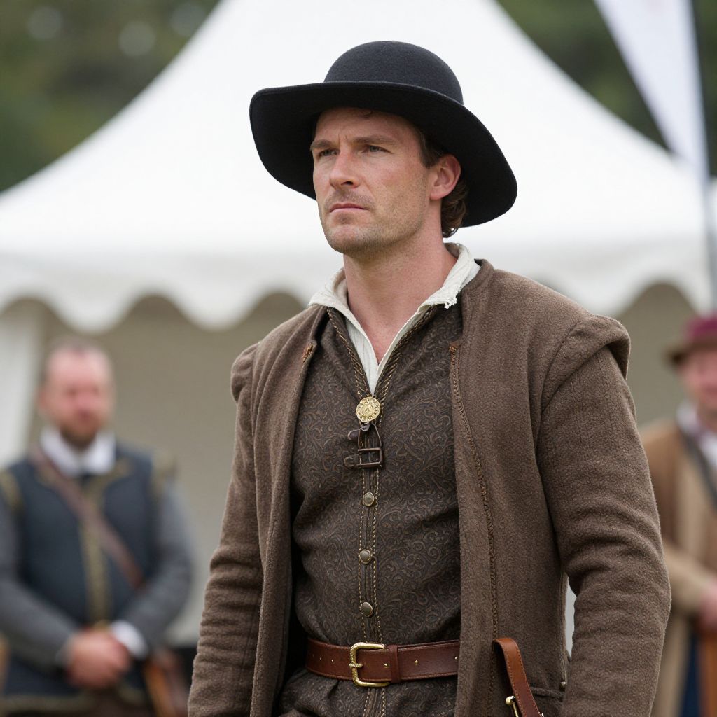 Renaissance Festival Costume Male, man in a hat and a brown jacket