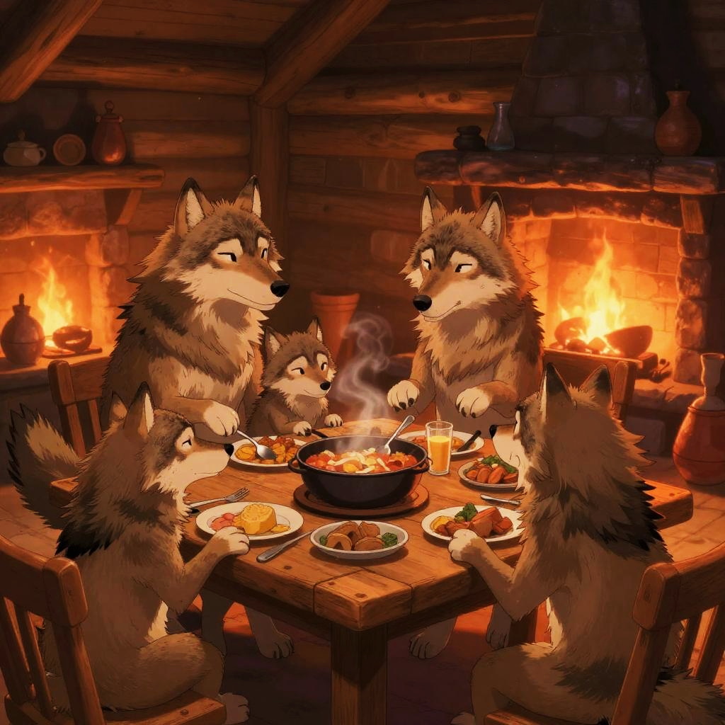 This is a digital painting depicting seven anthropomorphic foxes with varied fur colors (red, orange, white, and gray) sitting around a wooden table in a warmly lit, rustic tavern. They are dressed in medieval-style clothing with leather belts and vests. The foxes are engaged in a meal, with plates of food and mugs of drinks on the table. The background features wooden walls, hanging lanterns, and framed pictures. The warm, amber lighting creates a cozy, intimate atmosphere. The foxes have expressive faces, with some smiling and others looking at each other, conveying a sense of camaraderie and conversation.