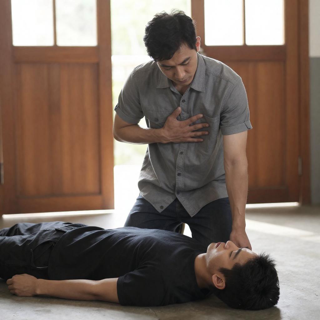 Photograph of a man with short, dark hair, wearing a gray, short-sleeved shirt, kneeling beside a fallen man in black clothing. The standing man's left hand rests on his chest, while his right hand supports his head. The background features wooden doors and a sunlit window. The fallen man lies on a concrete floor, face down.