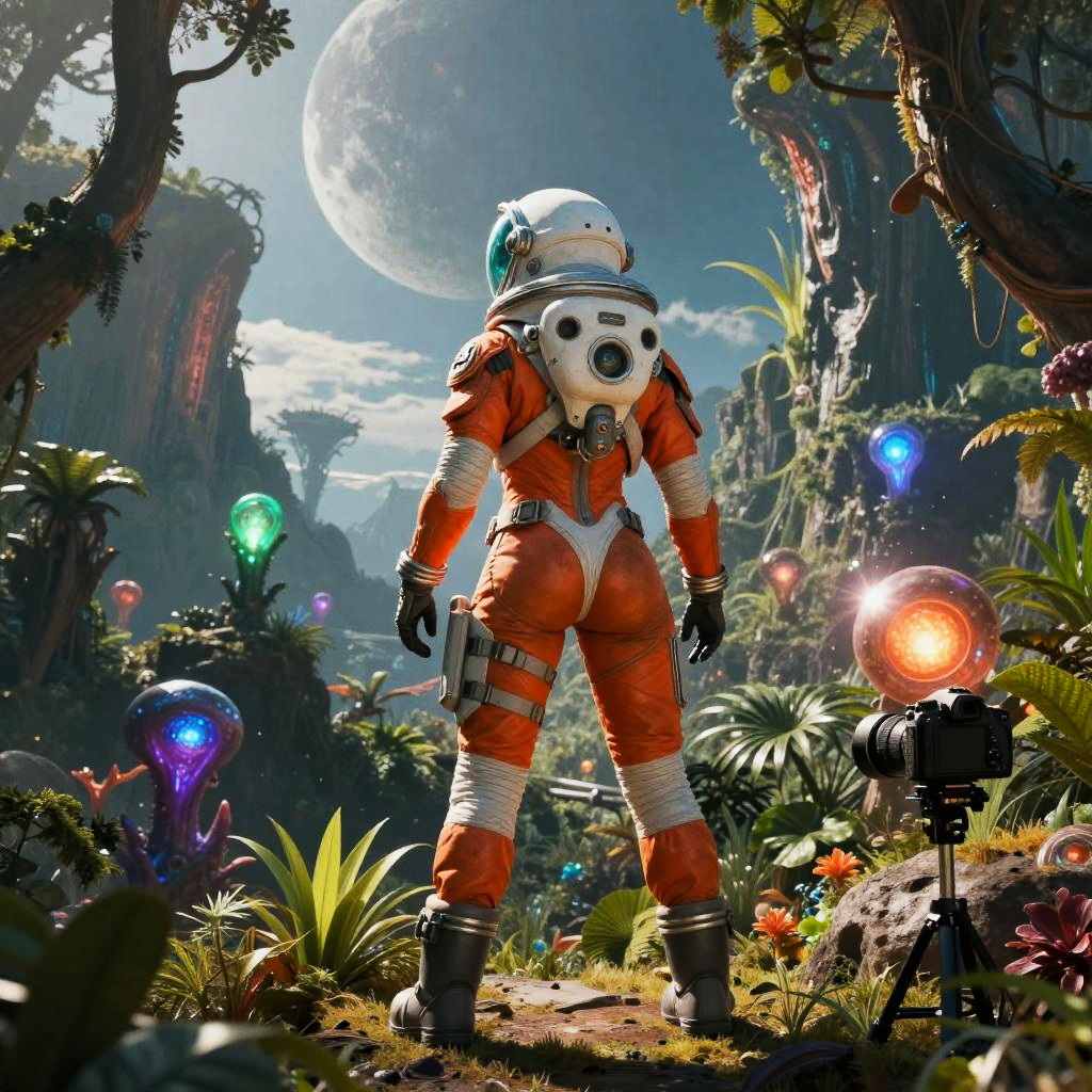 Masterpiece, highest quality, rear angle, Highly detailed photo of a (female space soldier wearing orange and white space suit, tinted face shield, rebreather, accentuated booty), athletic body, big ass, [wide hips], (investigating a strange glowing alien artifact), on alien exoplanet, (mountains:1.1), (exotic rain forest), lush vibrant foliage, (two moons in the sky:0.8), (hyperdetailed, intricately detailed), background by Jessica Rossier, (sci-fi), during the day, (lens flare:0.5), (bloom:0.6), particle effects, (cinematic lighting:1.1), sharp shadows, ambient light, [bioluminescente], raytracing, photographed on a Nikon Z7 II Mirrorless Camera, 120mm F/4 wide-angle lens, sharp focus, Cinestill 800T, still frame from Gravity 2013, 8k, HDR, from behind