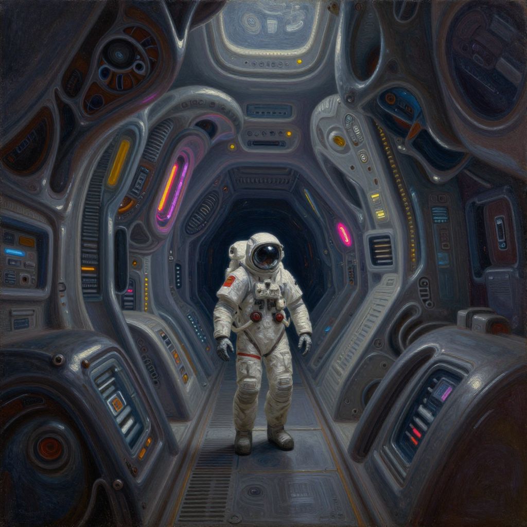Craft an oil painting that captures the eerie ambiance of bio-mechanical artistry, portraying a lone astronaut venturing through a maze-like space station with organic metal formations. Viewed from below, this vast and intricate environment showcases the astronaut's cautious progress down a corridor illuminated by flickering neon lights. The scene reflects both awe at the surreal elegance and apprehension towards the concealed perils hidden within the twisted shapes of this otherworldly architecture.