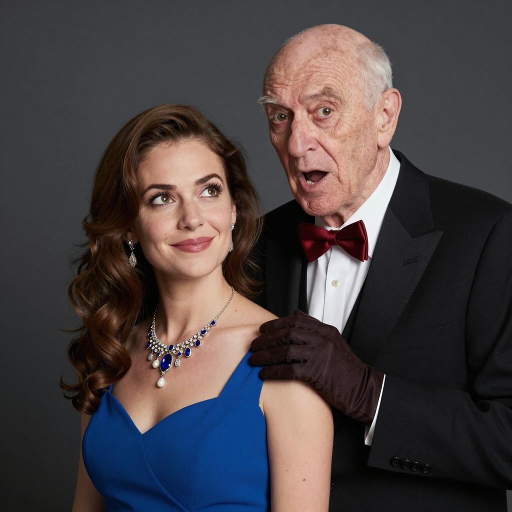 Old man with white hair in light beige suit, white shirt, and red tie. Young woman with curly brown hair, green eyeshadow, black strapless top, and green gloves. She leans into him, hand on his chest, looking up. Black background. Man smiles. Woman looks upward with intense expression. Two people.